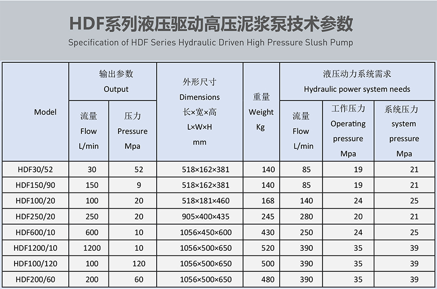 * 液压驱动高压泵的活动零部件少,输出效率高。多台HDF泵可串联组成泥浆泵组,输出流量和压力的选择灵活性大。